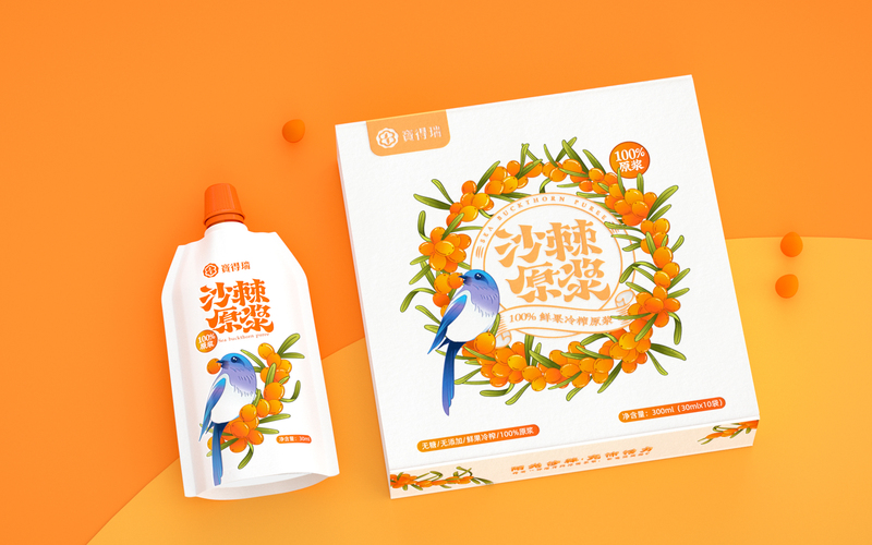 【产品描述】这是一款沙棘果汁,产品原料来自张北高原,计划由原料生产商直接销售的成品包装。【策略主张】我们希望通过包装表达它的天然、健康属性。因为其消费者主要为女性,所以同时希望包装兼具时尚打卡属性与礼品属性。【策略描述】我们以手绘的形式绘制沙棘果环与喜鹊(张北高原吃沙棘的鸟类,同时具备常见、喜庆的属性),表达天然健康的感觉。目前该项目已投产并商用。祝客户销售顺利。------倾新品牌包装设计侯维静
